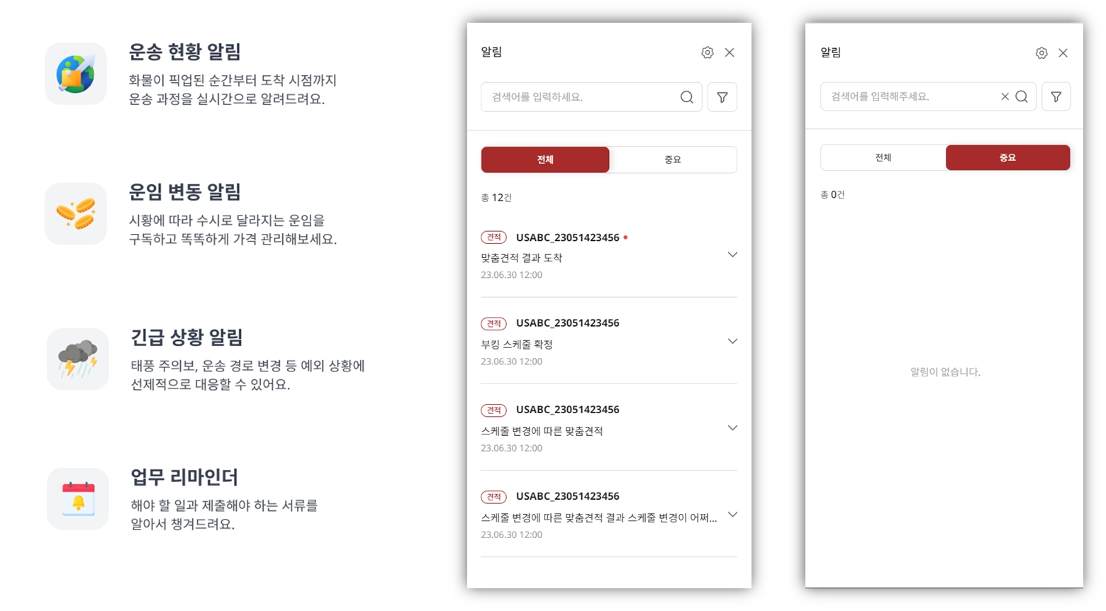 Even if your representative is unavailable or you haven't inquired first, you can receive all transportation-related notifications in real time through PantosNow's integrated notification center. We provide updates on booking progress, transportation status, and alerts for exceptions such as transportation delays or route changes.