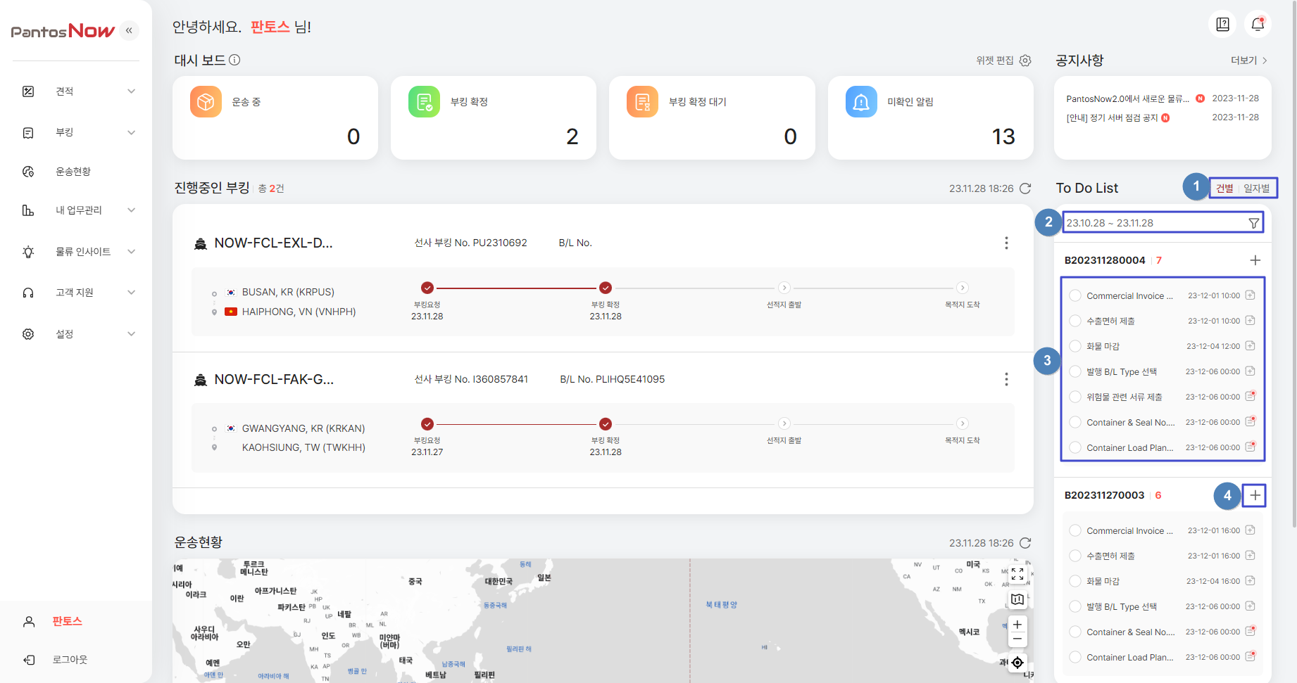 With PantosNow, you can view the key stages of logistics operations at a glance through widgets. Use the widget editing feature to create a personalized logistics dashboard.